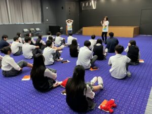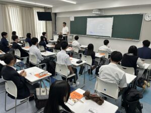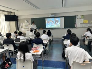 総合的な探究の時間(キャリア型未来探究)姉妹校講師派遣の4回目は、島田幼稚園教務主任の斎藤小世子先生、同じく教務主任の森川美穂先生に御来校いただきました。いつもの教室から8階体育館に移動して様々なレクリエーション(ぎょうざジャンケン、ケーキを作ろう)も体験することができました。幼児教育の難しさ、やりがいなどを学ぶとともに、各班が一致団結し大きな歓声とともに真剣に取組んでいました。