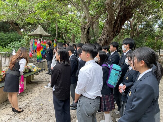 昼食後、平和祈念公園へ向かいました。平和祈念公園では、平和の礎まで進む間に、様々な沖縄戦でのお話をお聞きしました。その後、新里スエさんをお招きし、平和祈念資料館 祈念ホールにて沖縄戦についてお話しをお聞きしました。真剣に聞く生徒の姿はとても印象に残っています。