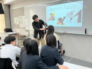 先回に引き続き、姉妹校である名古屋美容専門学校渉外主任の近藤龍起先生に御来校いただきました。前半は、国家資格である美容師の職業、やりがいなどについてお話をいただきました。後半は、ブロー実演があり、毛髪の三相構造、キューティクルの意味について理解することもでできました。