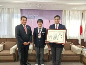 3年電気科の奥谷春希さんは、2025第20回若年者ものづくり競技大会(電気工事の部)において銀賞(準優勝)に輝くことができました。写真は、先日、奥谷さんの地元である江南市を表敬訪問した時のものです。奥谷さんの今後の活躍が大変楽しみです。