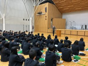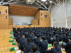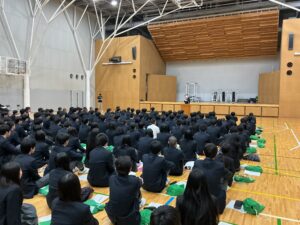 1、2時限目はアリーナへ移動して、副校長先生をはじめとする諸先生方による講話と集団行動を学びました。